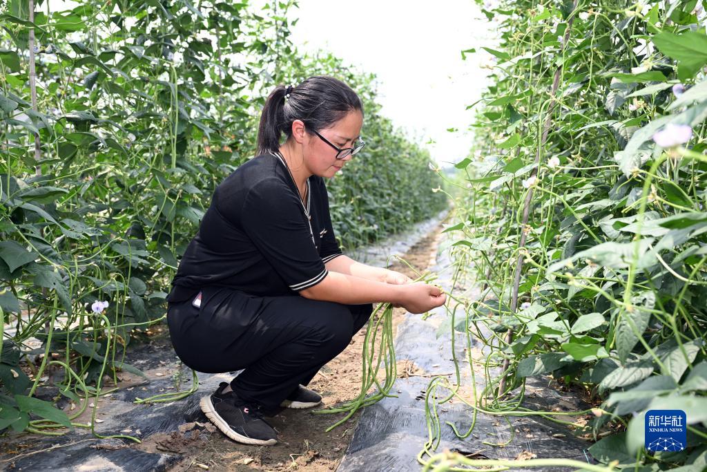 8月16日,余青青在樅陽(yáng)縣青園心家庭農場(chǎng)采摘豆角。