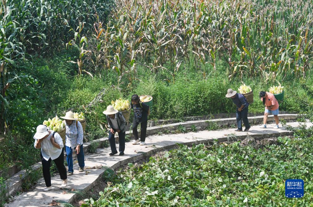 8月16日,村民在重慶市石柱土家族自治縣王家鄉光華村背運剛采摘的玉米。