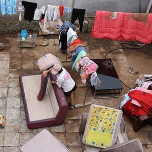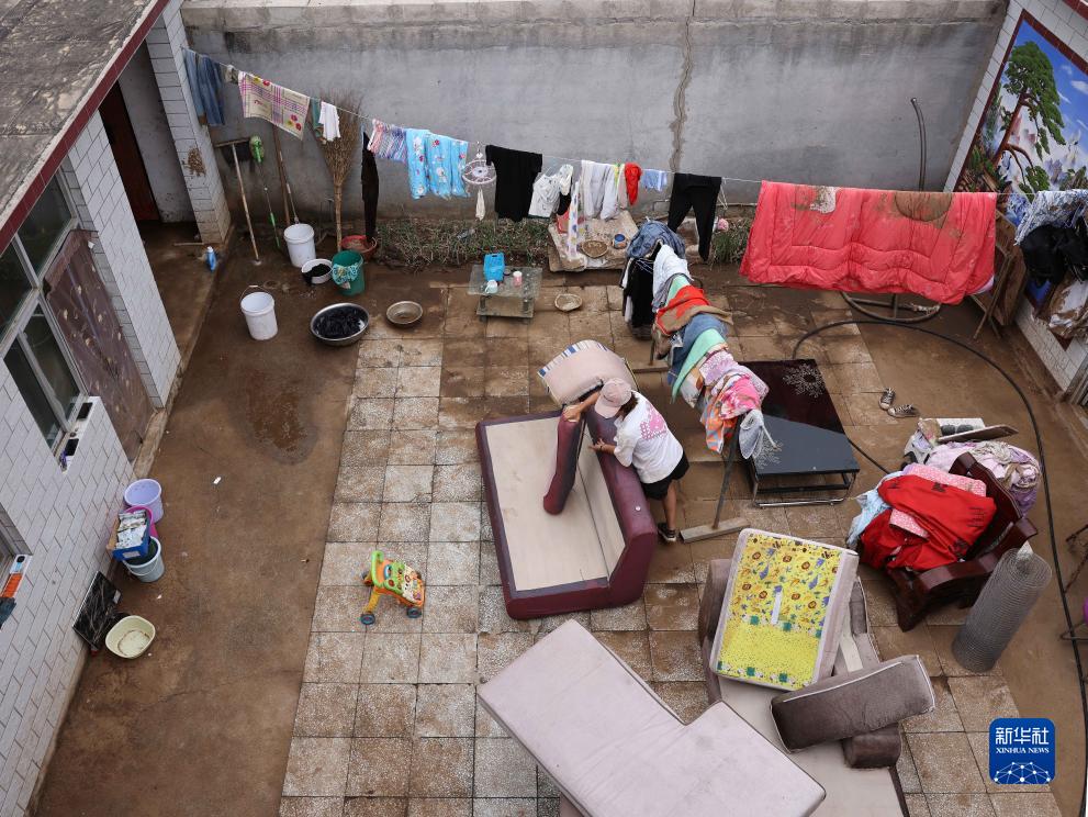 8月17日,河北省保定市淶水縣趙各莊鎮平峪村村民趙國金在家中收拾晾曬物品。