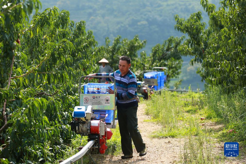 8月17日,在貴州省貴定縣德新鎮新鋪村黃桃種植基地,村民用軌道運輸黃桃。