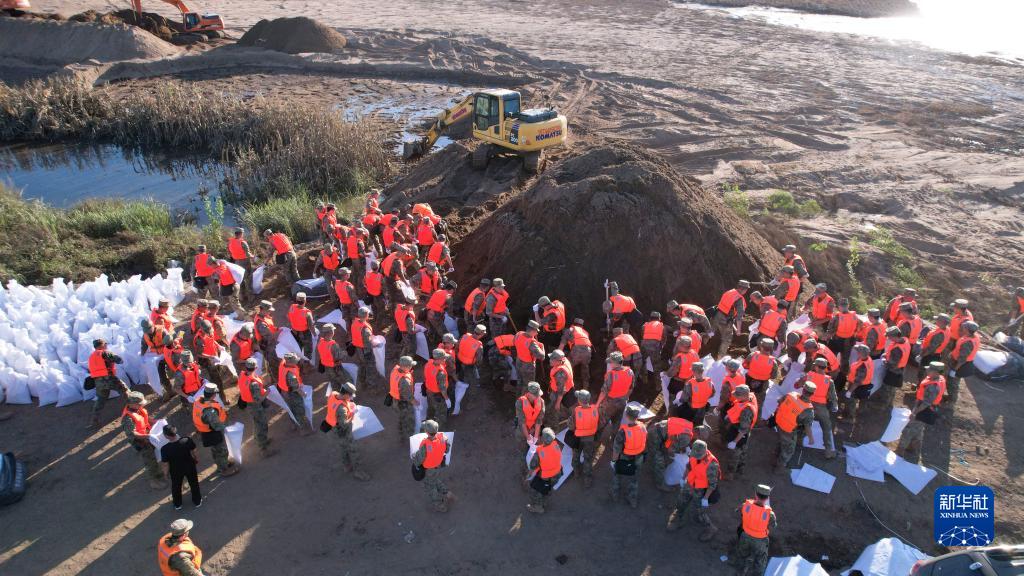 北部戰區陸軍某旅組織官兵在榆樹(shù)市拉林河青山段進(jìn)行堤壩加固作業(yè)(8月16日攝)。