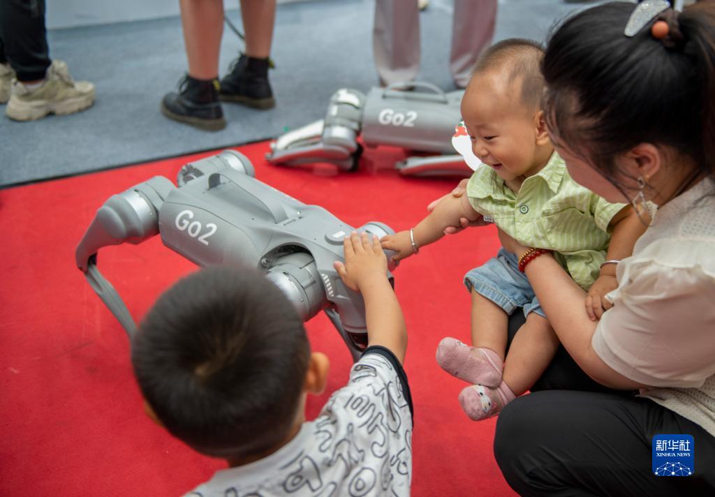 8月17日,小朋友在2023世界機器人大會(huì )現場(chǎng)與一款仿生四足機器人互動(dòng)。