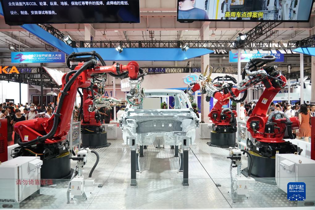這是8月17日在2023世界機器人大會(huì )現場(chǎng)拍攝的白車(chē)身焊點(diǎn)機器人工作站。