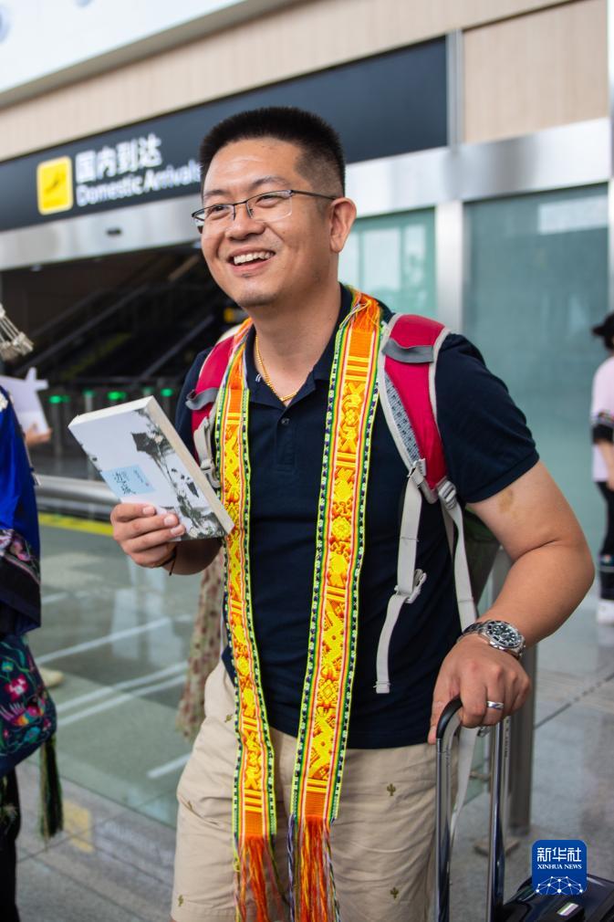 8月18日,一名抵達湖南湘西邊城機場(chǎng)的旅客獲贈花帶和書(shū)籍。