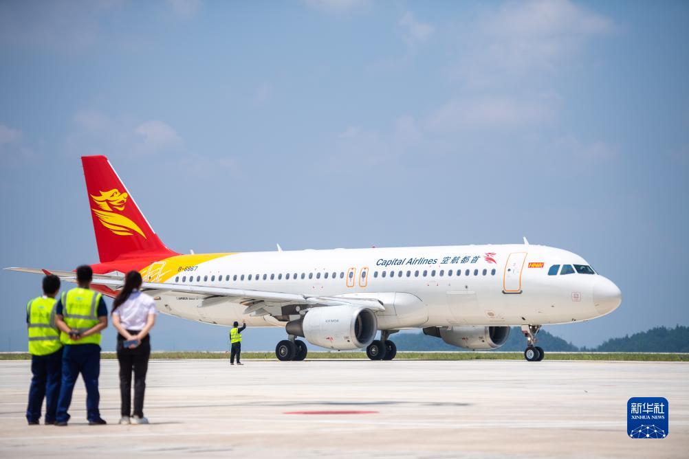 8月18日,湖南湘西邊城機場(chǎng)的地勤人員引導飛機滑行到跑道。