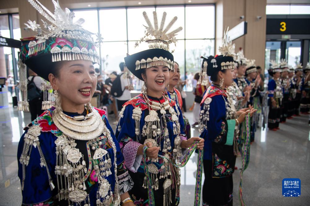 8月18日,當地群眾在湖南湘西邊城機場(chǎng)用傳統儀式迎接旅客。