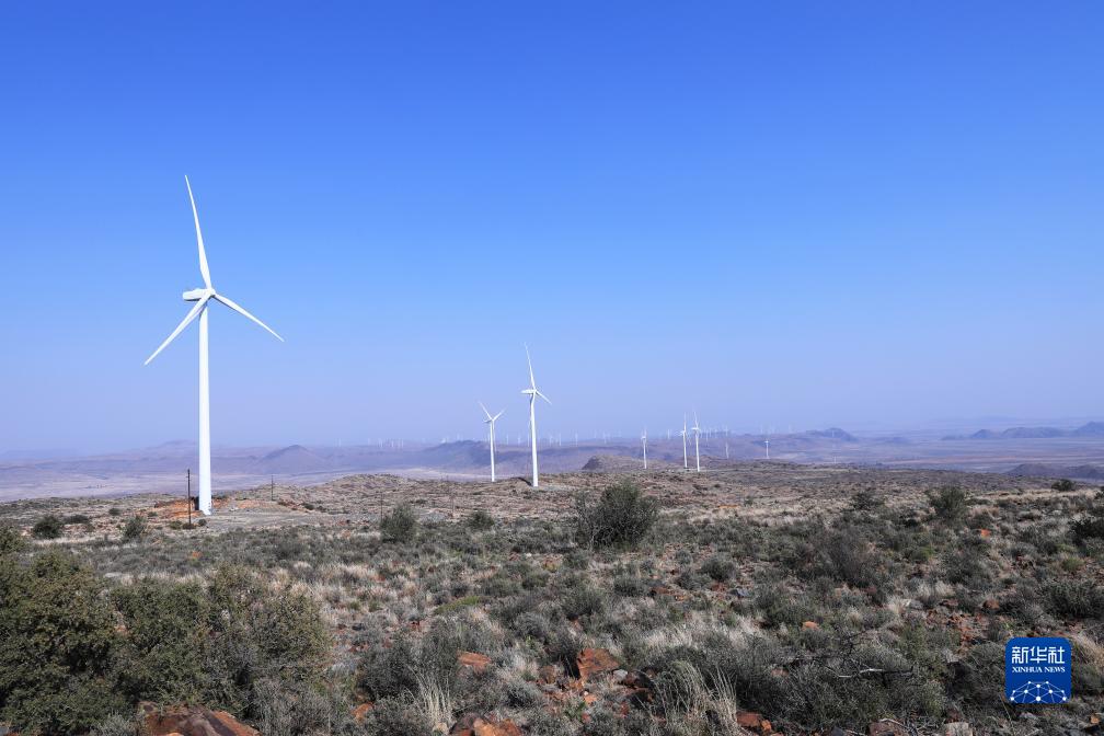 這是8月10日在南非北開(kāi)普省德阿鎮拍攝的龍源南非公司德阿風(fēng)電項目風(fēng)機。