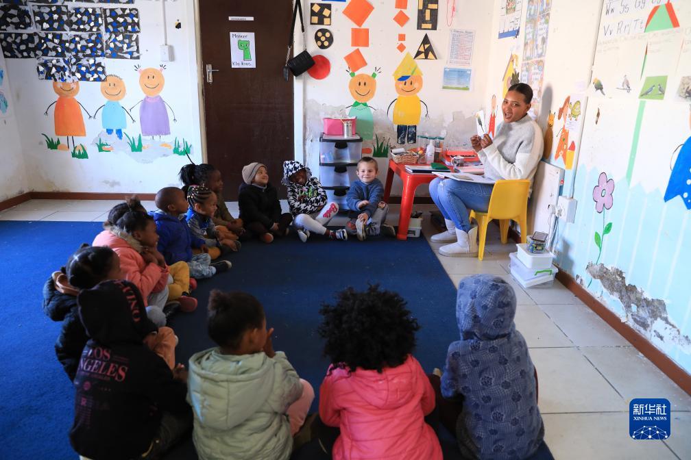 8月11日,在南非北開(kāi)普省德阿鎮一家龍源南非公司運營(yíng)的兒童早教中心,老師在給孩子們上課。
