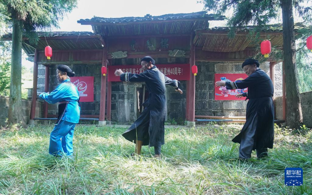 8月18日,舍米湖村村民在有著(zhù)數百年歷史的“擺手堂”前跳起擺手舞。
