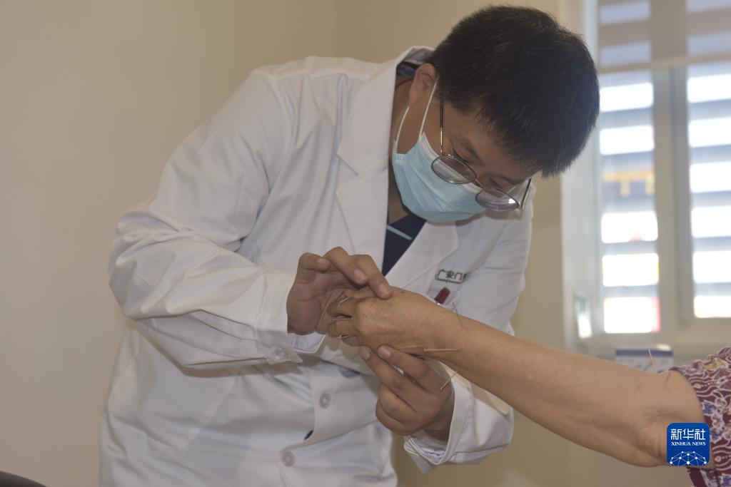8月18日,在柬埔寨首都金邊的考斯瑪中柬友誼醫院,援柬中醫醫療隊醫生為患者診療。