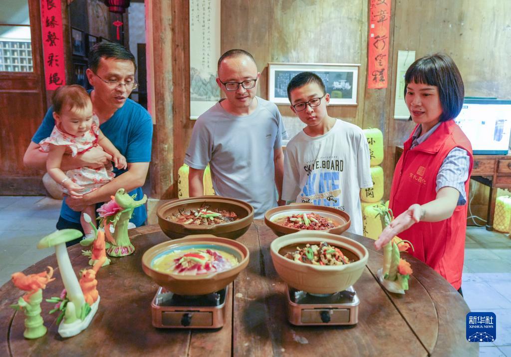 8月18日,在昌化鎮“唐昌之夜”主題文化節現場(chǎng),黨建聯(lián)建志愿者(右一)在給游客介紹昌化特色美食。