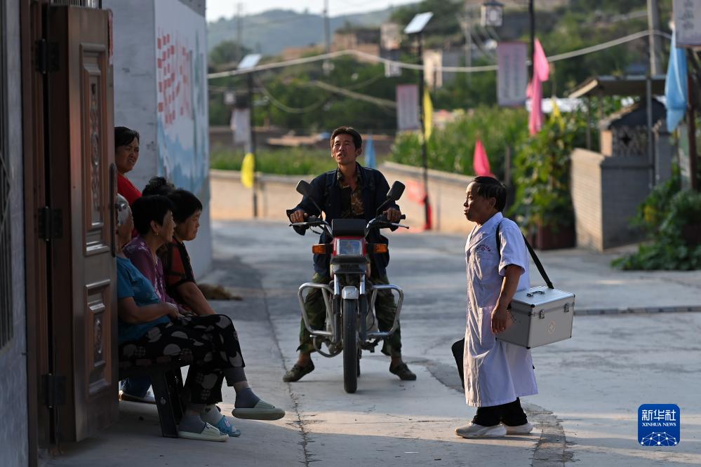 在石樓縣龍交鄉王家溝村,鄉村醫生楊興榮(右)和村民聊天(8月14日攝)。