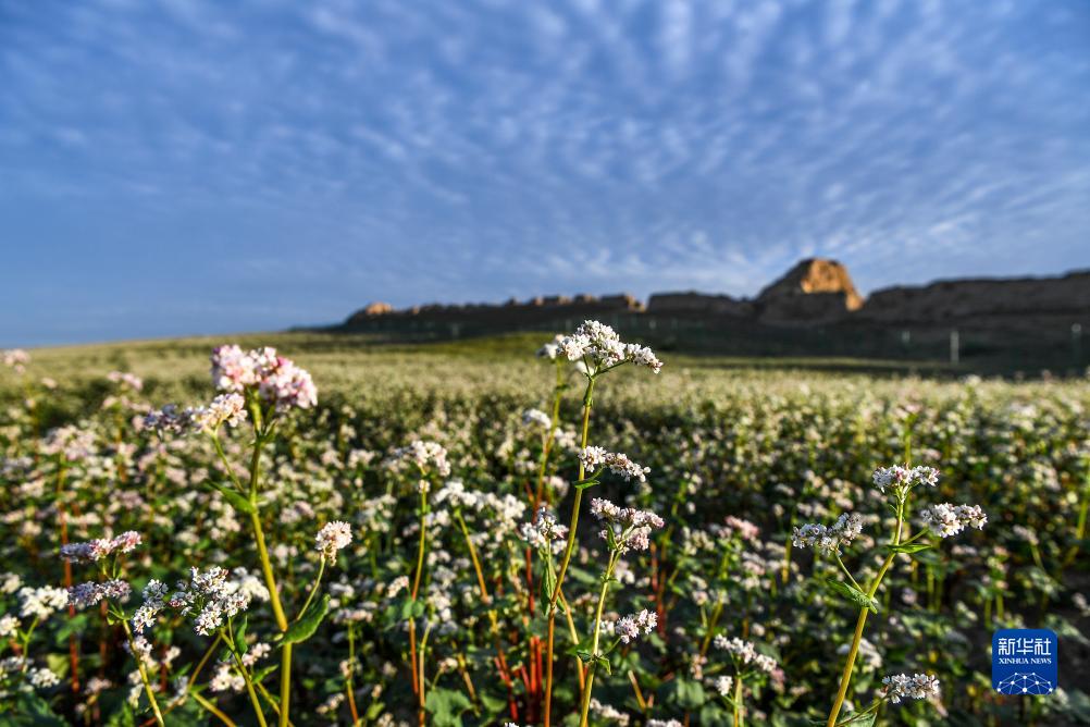 鹽池縣一處長(cháng)城腳下蕎麥花開(kāi)放(8月18日攝)。