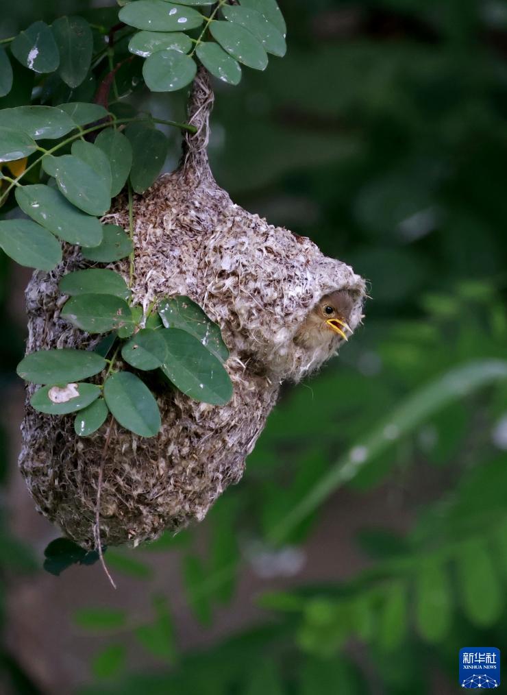 8月19日,一只中華攀雀雛鳥(niǎo)從巢穴中向外張望。