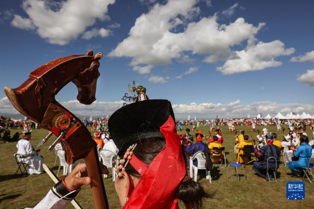 8月18日,在蒙古國泰吉山谷,文化節開(kāi)幕式上演員在演奏馬頭琴。