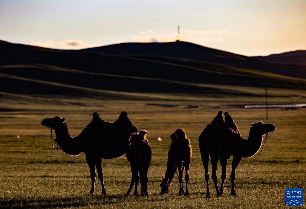 這是8月18日在蒙古國泰吉山谷拍攝的沐浴在夕陽(yáng)里的駱駝。