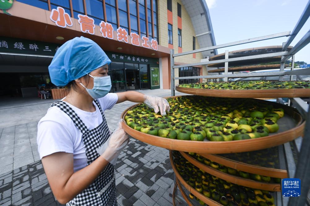 8月20日,在浙江省建德市三都鎮松口村的小青柑共富工坊,工人把青柑茶搬運至曬場(chǎng)進(jìn)行晾曬。