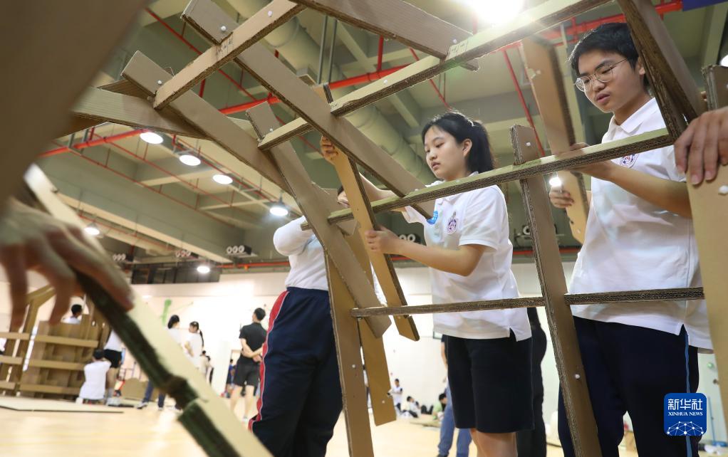 8月20日,來(lái)自上海市南洋模范中學(xué)的學(xué)生在學(xué)生建造節活動(dòng)中搭建參賽作品。