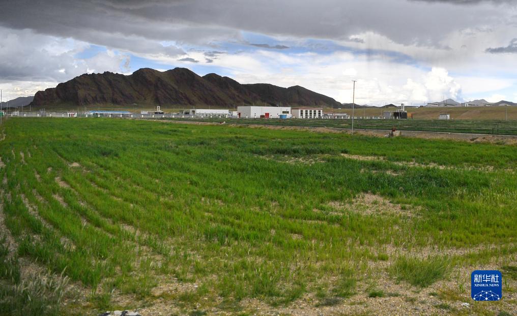 措勤縣高原生態(tài)畜牧業(yè)現代化養殖一體化產(chǎn)業(yè)綜合基地合作社人工草場(chǎng)和遠處的產(chǎn)業(yè)園區廠(chǎng)房(8月19日攝)。