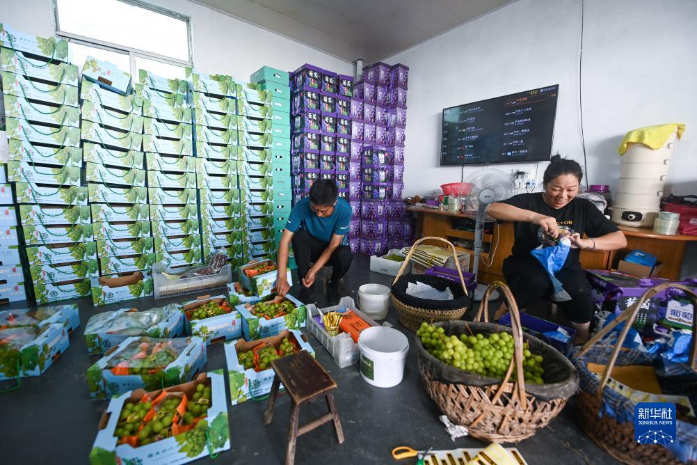 8月20日,在諸暨市姚江鎮紫草塢村阿群家庭農場(chǎng)內,種植戶(hù)打包成熟的葡萄,準備運往市場(chǎng)。