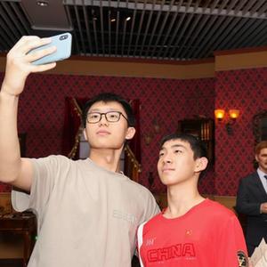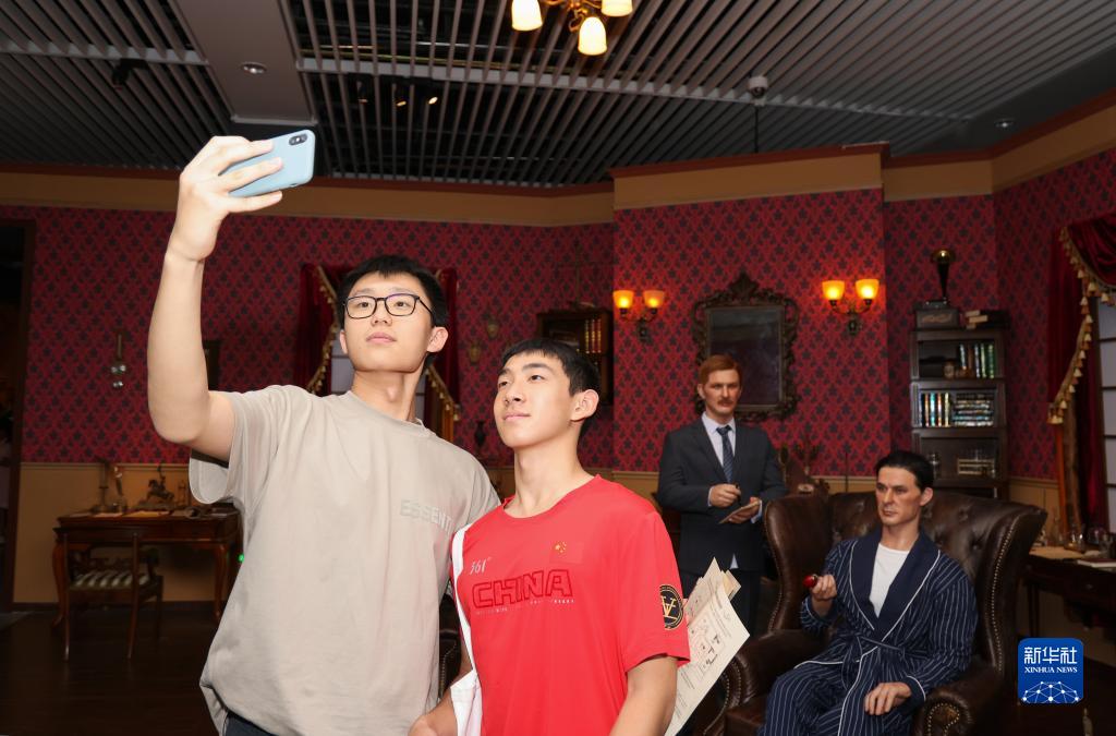 8月20日,兩名學(xué)生在“福爾摩斯大型沉浸式主題展”上與人像合影。