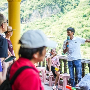 馬選軍向從廣東來(lái)的游客介紹北盤(pán)江大橋和家鄉的變化(8月16日攝)。