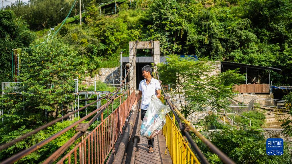 馬選軍在農家樂(lè )附近拾撿垃圾(8月15日攝)。