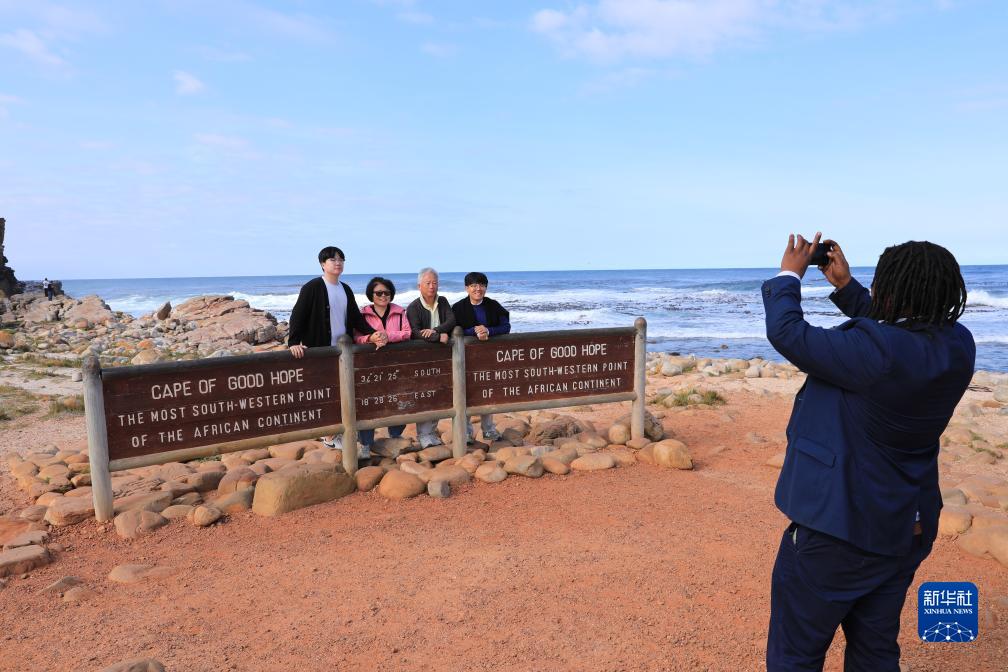 8月12日,游客在南非開(kāi)普敦好望角合影。