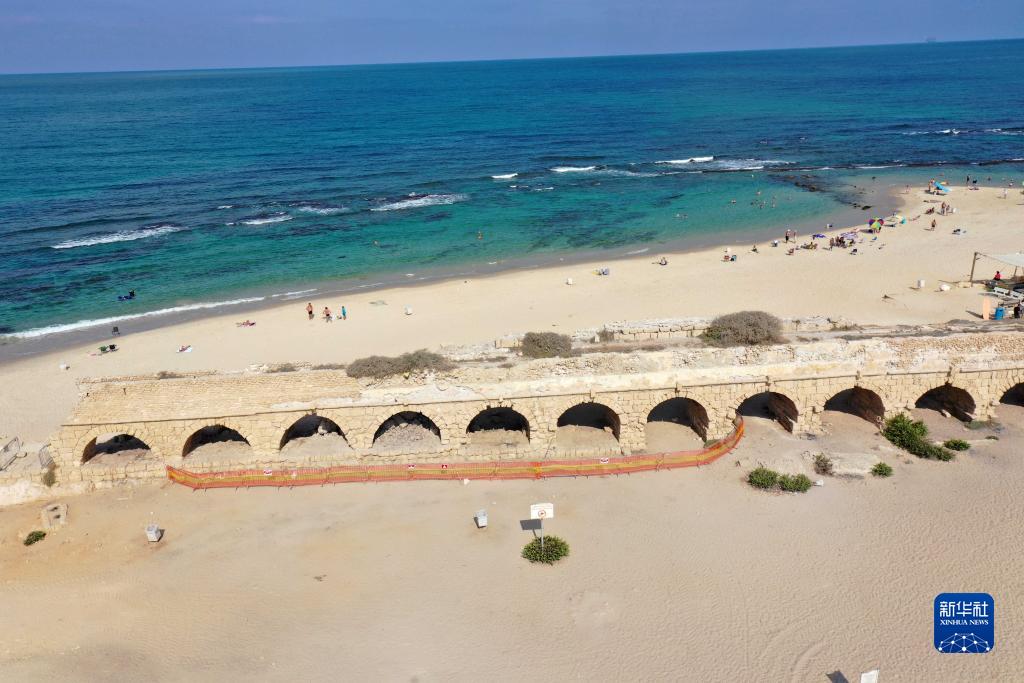 這是8月20日在以色列城市凱撒里亞拍攝的古羅馬渡槽遺址(無(wú)人機照片)。