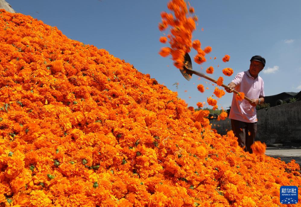 8月20日,在河北省平泉市平北鎮的萬(wàn)壽菊花朵收儲基地,農民將剛剛采收的萬(wàn)壽菊花朵進(jìn)行集中收儲。