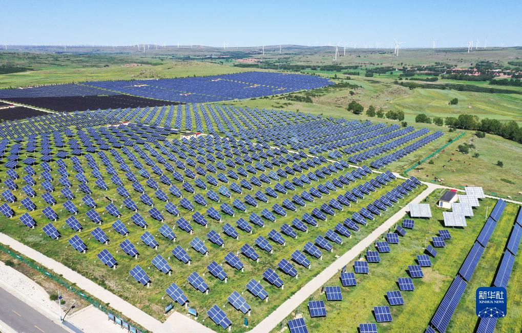 光伏板整齊排列在位于河北張家口的國家級可再生能源示范區內(8月18日攝,無(wú)人機照片)。由國網(wǎng)冀北電力建設運營(yíng)的國家風(fēng)光儲輸示范工程將當地豐富的風(fēng)能、太陽(yáng)能轉化為綠色清潔的電能。