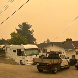 8月20日,在加拿大基洛納,車(chē)輛在野火煙霾籠罩中的道路上行駛。