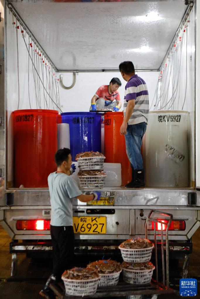 8月16日,在浙江省舟山市普陀區舟山國際水產(chǎn)城,工作人員將梭子蟹放在充氧水桶里。新華社記者 劉夢(mèng)琪 攝