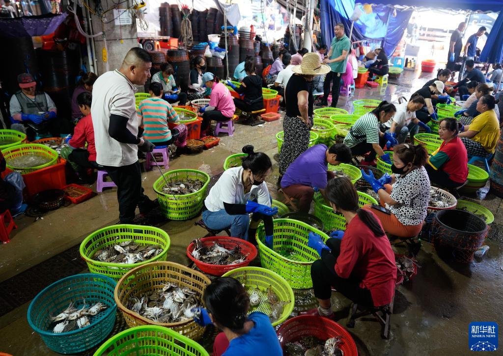 8月17日,在浙江省舟山市普陀區舟山國際水產(chǎn)城,工作人員按級分揀梭子蟹。新華社記者 韓傳號 攝