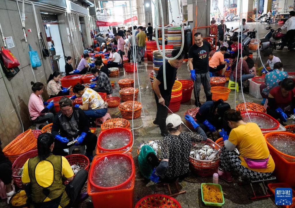 8月17日,在浙江省舟山市普陀區舟山國際水產(chǎn)城,工作人員按級分揀梭子蟹。新華社記者 韓傳號 攝