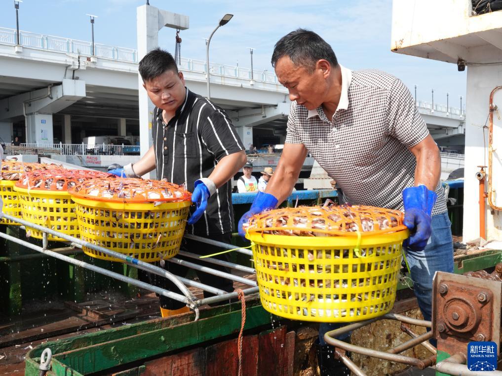 8月16日,在浙江省舟山市普陀區舟山國際水產(chǎn)城碼頭,工作人員從漁運船上卸下新鮮梭子蟹。新華社記者 翁忻旸 攝