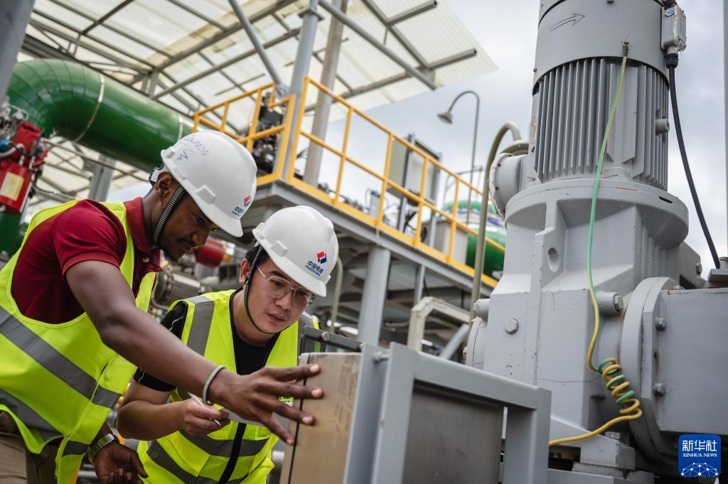 5月26日,施工人員在位于肯尼亞納庫魯市的索西安地熱電站項目建設現場(chǎng)檢查發(fā)電設施。