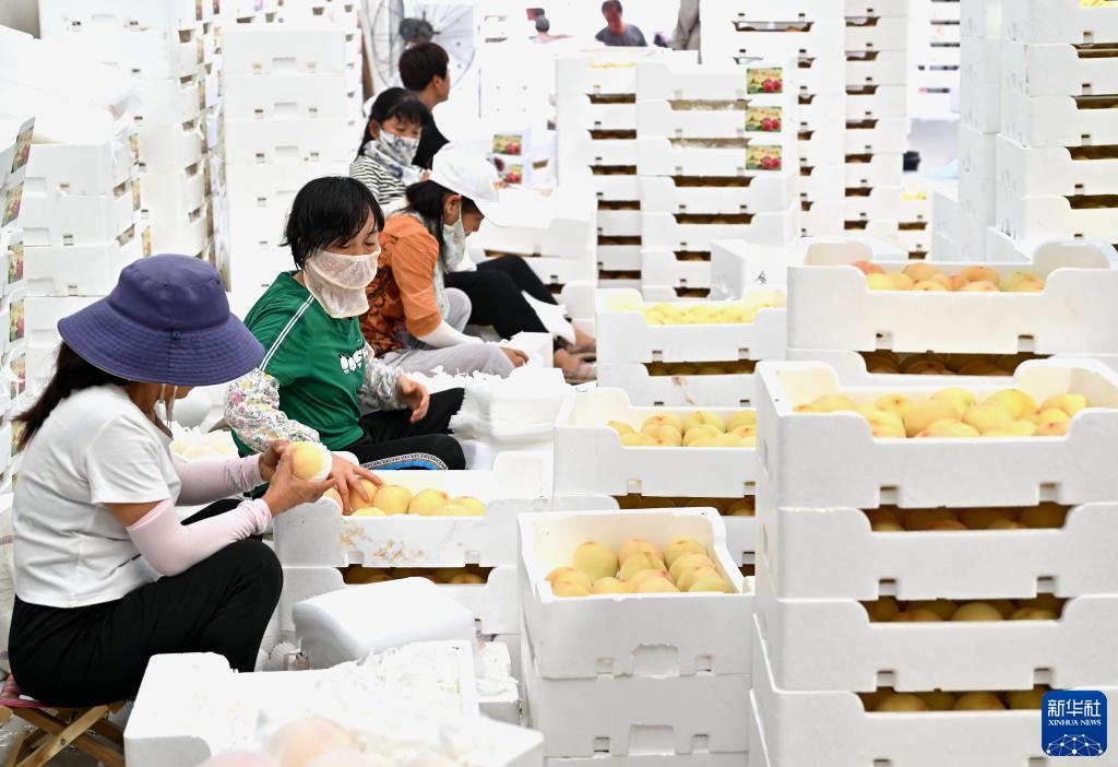 8月21日,唐山市豐潤區左家塢鎮一家鮮桃種植合作社的社員分揀包裝收獲的鮮桃。