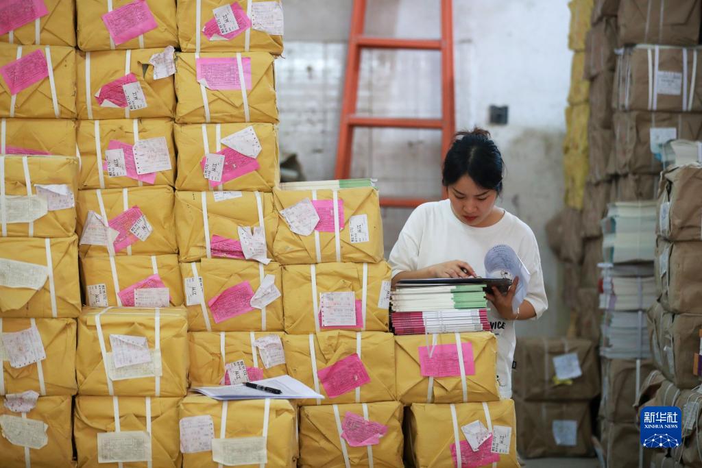 8月20日,工作人員在貴州省從江縣新華書(shū)店教材倉庫內清點(diǎn)登記新學(xué)期教材。