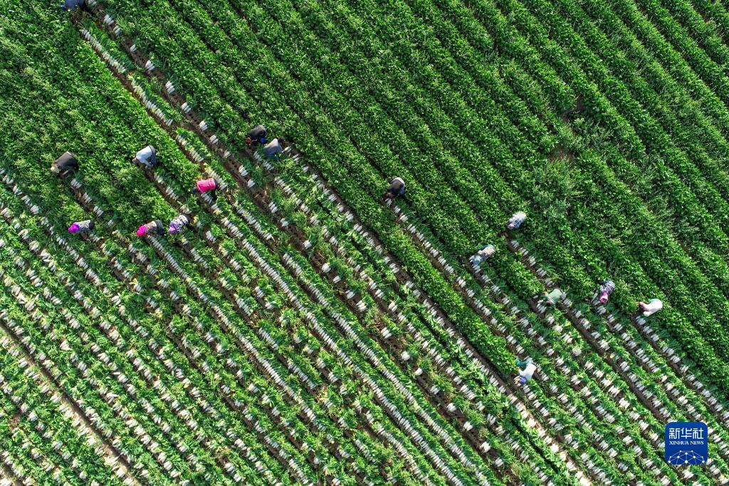 8月21日,農牧民在鄂托克前旗城川鎮白蘿卜種植基地收獲白蘿卜(無(wú)人機照片)。