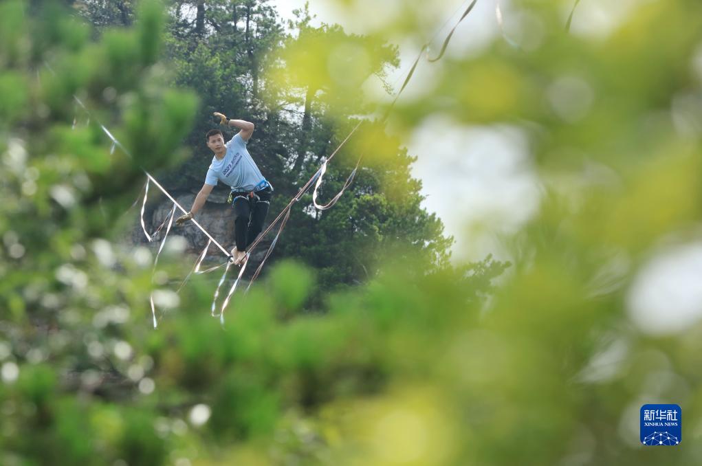 8月21日,2023年張家界黃石寨高空扁帶賽在湖南張家界國家森林公園黃石寨舉行。來(lái)自中國、法國、西班牙等國家和地區的選手在峰林之間競技。