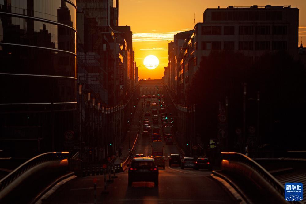 當日,在比利時(shí)首都布魯塞爾,夕陽(yáng)從主干道法律大街上空緩緩落下,形成“懸日”景觀(guān)。