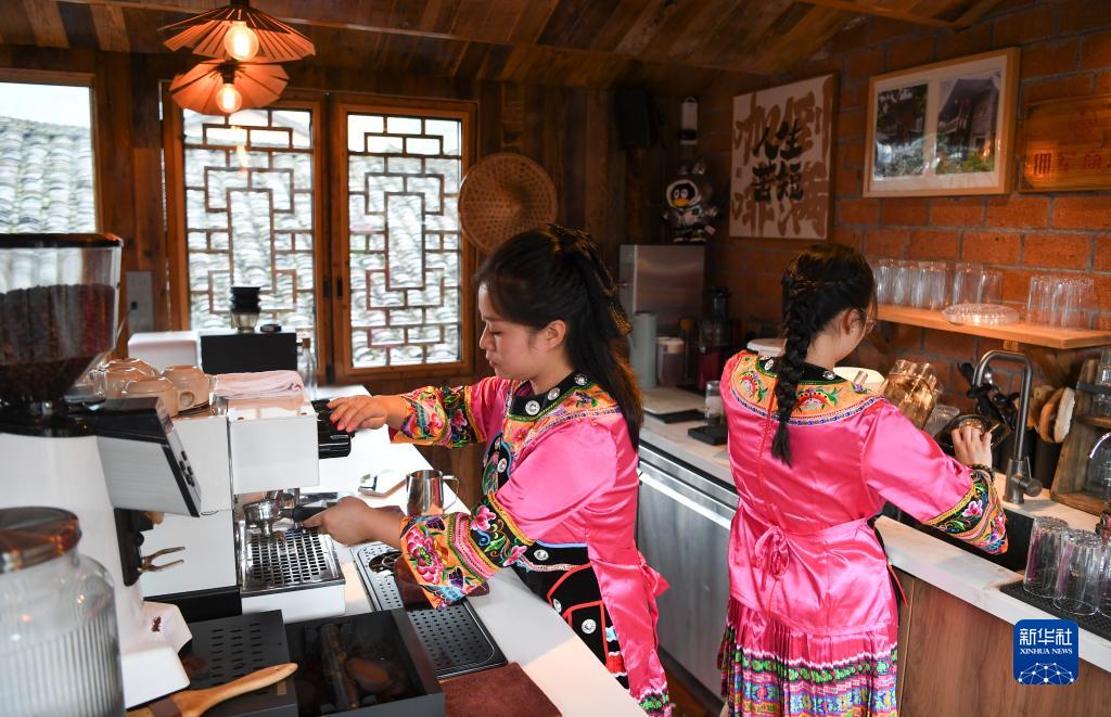 8月20日,酉陽(yáng)縣花田鄉何家巖村一家咖啡廳的工作人員在準備飲品。