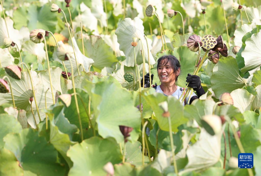 8月22日,在貴州省黔東南苗族侗族自治州岑鞏縣客樓鎮下寨村,村民在采收蓮子。