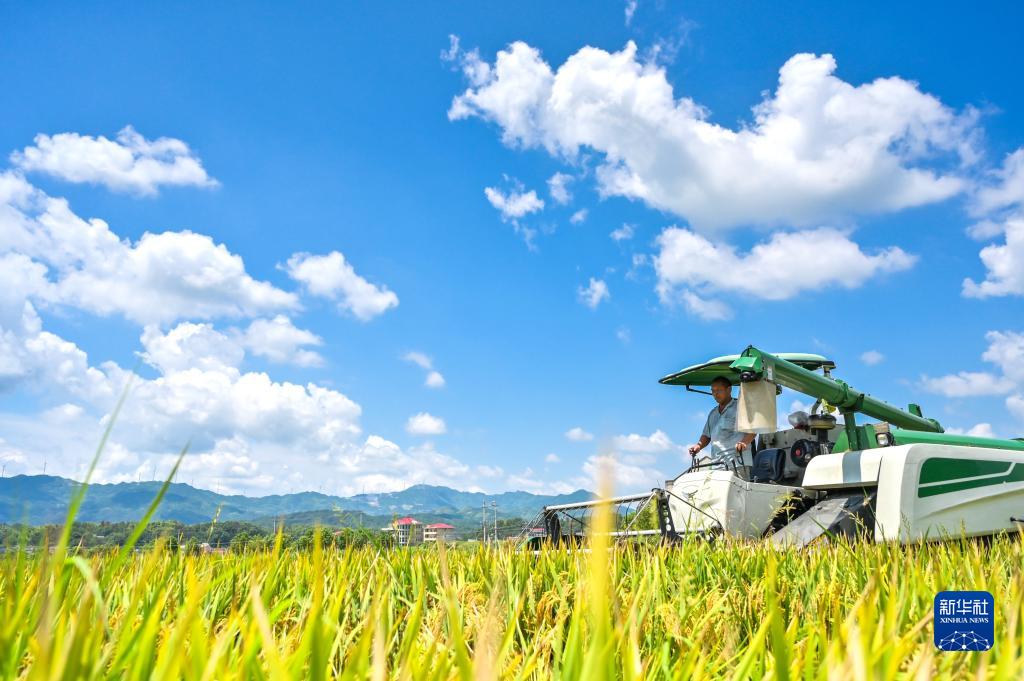 8月22日,在湖南省婁底市雙峰縣井字鎮花橋村,農民駕駛收割機收割稻谷。