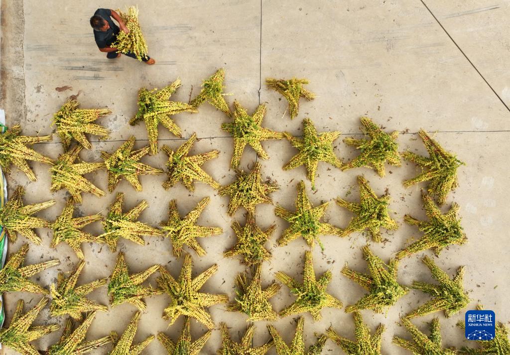 8月21日,在湖南省衡陽(yáng)市衡東縣大浦鎮,當地村民在晾曬芝麻(無(wú)人機照片)。