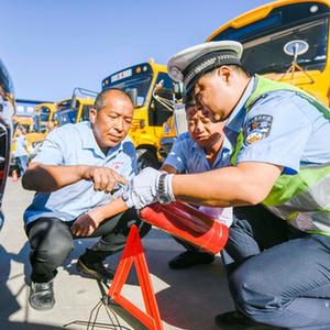 8月22日,民警在河北省遵化市一車(chē)輛檢測場(chǎng)檢查校車(chē)滅火器。
