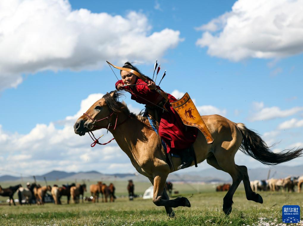 8月19日,在蒙古國泰吉山谷,一名女選手在蒙古國“游牧民族”世界文化節上展示騎馬射箭。