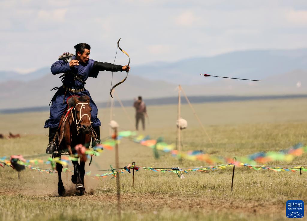 8月19日,在蒙古國泰吉山谷,選手在蒙古國“游牧民族”世界文化節上展示騎馬射箭。