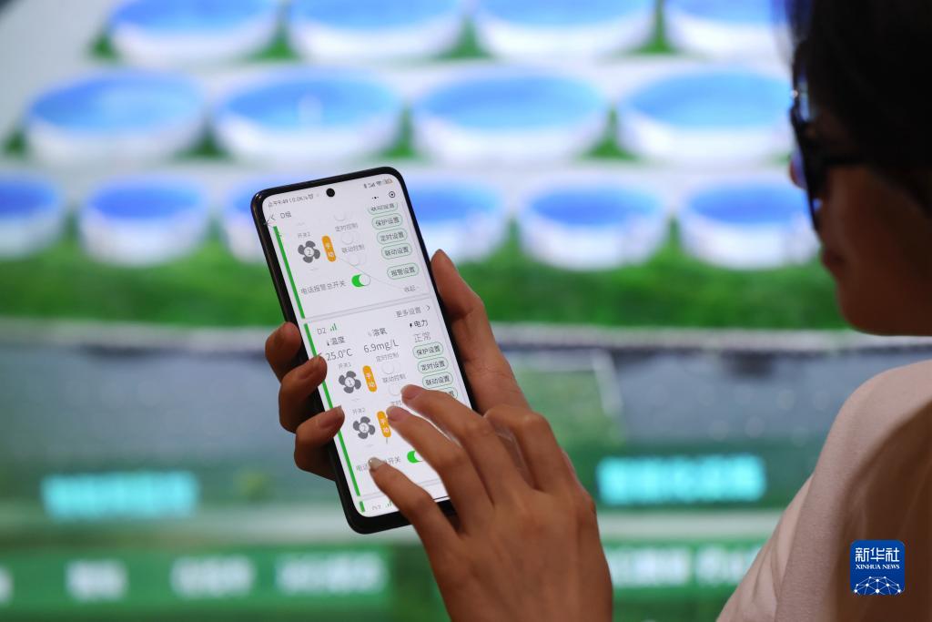 8月22日,在德清縣下渚湖街道和睦村“數字漁倉”養殖基地,管理員用手機對魚(yú)塘進(jìn)行遠程監控。